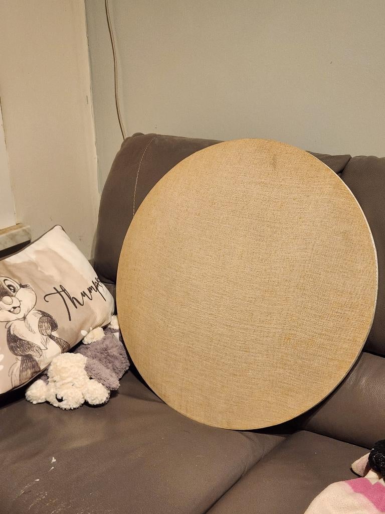 4 mars 26KateSint-Kruis - Coussin à dentelle aux fuseauxDiamètre 60 cm. Trou central à l'arrière pour un pied. Date du début des années 80. Utilisé. Quelques traces d'humidité sur le bois (à poncer légèrement pour faire disparaître).Enlèvement