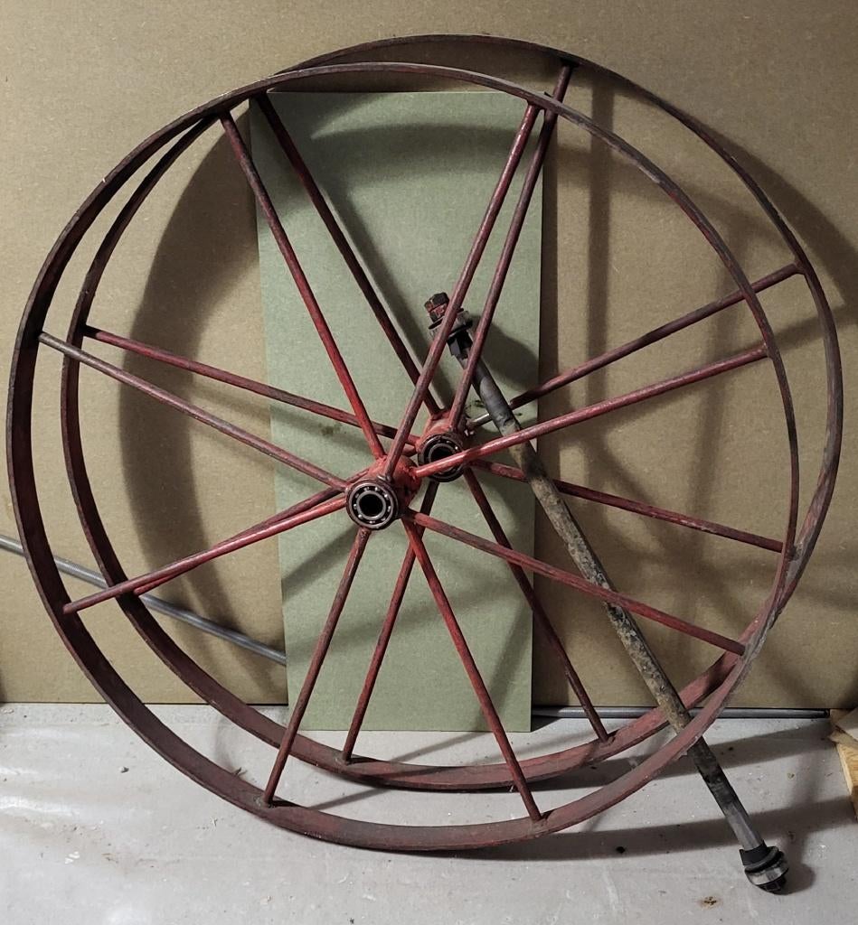 25 mars 26OlivierMeulebeke - Très ancienne roue de chariot à anneaux forgés.Très ancienne roue de chariot à anneaux forgés.Comme neuf Enlèvement ou Envoi