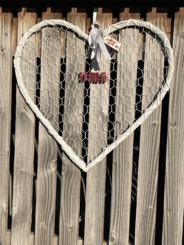 10 avr. 25DizzyOostakker - hartvormige fotohouderWitte houder in hartvorm voor foto's, postkaarten, ... Buitenrand in een soort gevlochten riet, binnenvlak in kippengaas. De foto's hangen aan kleine donkerrode wasspeldjes. Hoogte 60 cm. BreeNeuf Enlèvement