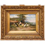 Aujourd'huiEvertOpwijk - Jef Louis van Leemputten (1867-1948) - Sunny StrollersSunny strollers, een origineel olieverfschilderij van de belgische kunstenaar jef louis van leemputten (1920–1930), met een haan en kippen, handgesigneerd, 24 × 36 cm, in redelijke staat en verkocht m