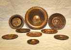 - Wandbord (9) - Koper, MessingVolledige collectie van 9 vintage geembosteerde koper- en messing wandplaten in mid-eeuwse europese volkskunst, met de handgemaakte repoussédecoratie, circa jaren 1960–1970 en afkomstig uit frankrijk.