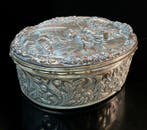 HierPub au topCatawikiToute la Belgique - Sieradendoos - Doos - Cadeaudoos - Verzilverd metaal - StofRaffinata ovale metalo argentato sbalzato e cesellato portagioiebox, fine xix – begin xx secolo van italiaanse productie.suggestieve, mooi in vorm en uiterlijk, gemaakt van verzilverd metaal en rijkel