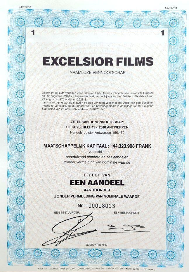 27 mars 26John MayBorgerhout - Excelsior Films (Antwerpen) 1992/93Origineel niet geannuleerd aandeel met volledig nog aangehecht couponblad en voorzien van watermerken. Antwerpen was ooit nog in de ban van de flamboyante cinemabaas en icoon "baron heylen van oiEnlèvement ou Envoi