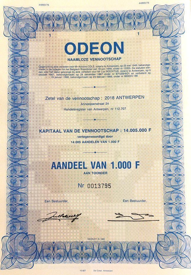 - Odeon (Rex concern Antwerpen) 1988Aandeel van 1000 bfr, niet geannuleerd, dubbelzijdig bedrukt en met volledig couponblad. Antwerpen was ooit nog in de ban van de flamboyante cinemabaas en icoon "baron heylen van oirland" diEnlèvement ou Envoi