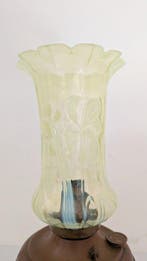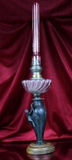 30 mars 26NickyAalst - Lampe à huile - Verre, Métal, BoisLampe à pétrole art nouveau datée 1890–1919, avec réservoir en verre, base en métal et socle en bois, dimensions 12 × 12 × 57 cm, poids 2 kg, origine france, en bon état d’usage et en état de fonction