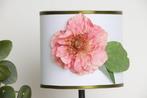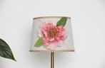 - Lampe de table de chevet - Métal, TextileLampe unique faite à la main avec abat-jour en textile écru orné d’une pivoine rose et d’un ruban marron doré, pied en métal doré, fabriquée en france ; dimensions 18,5 x 18,5 x 38 cm, culot e14, puis
