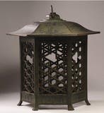 31 mars 26webwinkel rankei nijmegenoeffelt, NL - Lanterne suspendue japonaise en bronze, rare et antique,Lanterne japonaise suspendue en bronze hexagonale de l’époque edo, authentique et en bon état, hauteur 26,5 cm et largeur 18,5 cm, couronne à douze pétales, chambre de feu en treillis amime sukashi, r