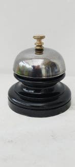 Avant-hierPub au topCatawikiToute la Belgique - Servicebel - Bois noici - Rijk - FrankrijkAntiekmodel staande bel voor balie voor hotel of landhuis uit frankrijk, gedateerd 1950–1960, in een chromen koepel en een glanzende bois noici houten voet, afmetingen ca. 8,5 Cm breed bij 8 cm diepte