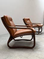- IKEA - Fauteuil - Baden - Rattan, Bamboe, Leder, Canvas - 2Twee ikea baden bambstoelen met cognacleren bekleding, ontworpen in zweden in de jaren zeventig, in uitstekende staat met minimale gebruikssporen en afmetingen: 64 cm breed, 77 cm hoog, zithoogte 38 c
