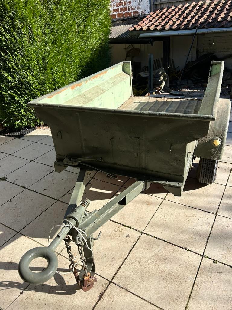 12 oct. 25WimMerchtem - Aanhangwagen Remork leger gr.Remork leger gr. L 176 cm b 119 cm zonder wielkas h 80 cm dessel. L 110 cm bladveren met extra vering 3 wielen stroom/ lichten aanwezig banden zeer goed ! Inclusief frame vooraan houtwerk nog fair achEnlèvement