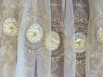 Tissu coton d’origine italienne, modèle tulle baroque élégant et précieux avec médaillons floraux, blanc, dimensions 3,0 m sur 3,96 m, état comme neuf, période estimée 2020+, avec broderie de médaillons floraux couleur or pâle adaptée à des rideaux, ...