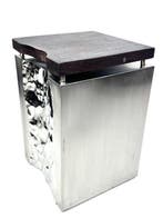 1 avr. 19CatawikiToute la Belgique - Kruk - Staal, Hout - OntwerpsculptuurSculpturaal designstool uit massief hout met live-edge rand, basis van geborsteld metaal, gemaakt in italië, scultoreo di design, 46 × 29 × 29 cm, in nieuwstaat. Kruk vervaardigd uit een genereus blok
