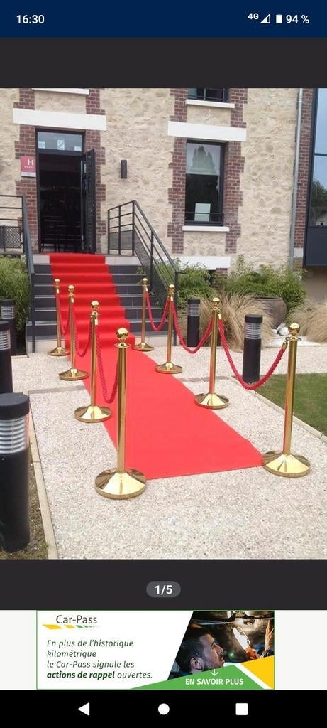 25 mars 19Arti-EventsRelegemCommandez votre tapis rouge MAINTENANT - pour les fêtes à veRelegem25 mars 19 - Potelet de controle des foulesLocation : set de 4 poteaux dorés + 3 cordes velours rouge / hauteur environ 1m et 4,5m de long / base alourdie pour la stabilité . - Poteaux de contrôle de foules , files , balisage ...Etc...UtilisatNeuf Enlèvement