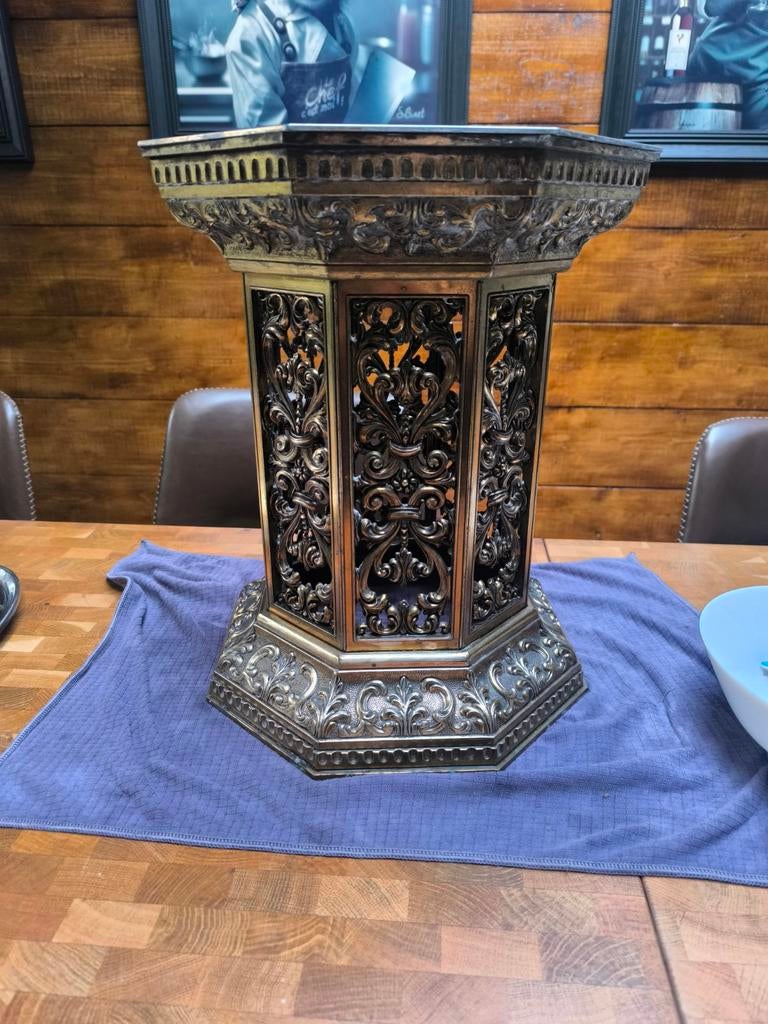 28 mars 26Lenders AlainWarchin - Piédestal hexagonal décoratifIl s'agit d'un piédestal hexagonal décoratif souvent utilisé comme support pour plantes, sculptures ou comme base de table d'appoint. L'objet est de style néo-renaissance, probablementEnlèvement
