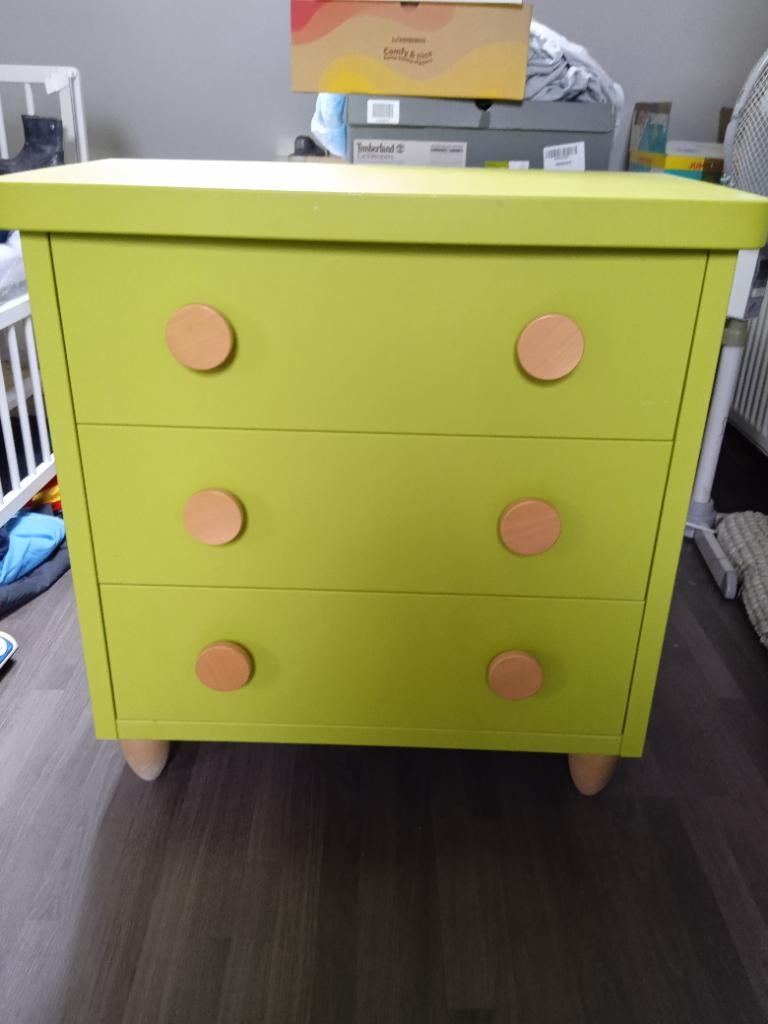 7 mars 26ArtZoneMons - Ladekast Mammut groenCommode met 3 lades van mammut, zeer stevig en gebruiksvriendelijk. Afmeting: 0,77m breed, 0,44m diep en 0,78m hoog. Af te halen in pamel.Utilisé Enlèvement