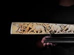 21 mars 26Maxime MarkussenWaarschoot - PAS DE RÉSERVE - Étonnant grand ivoire sculpté despadonTusk de marlin d’indonésie sculptée d’un motif famille de mammouth laineux, 80 cm de long, 14 cm de haut, 6 cm de profondeur, environ 1400 g avec le socle, datée de 2026, authentique/officiel, non cit