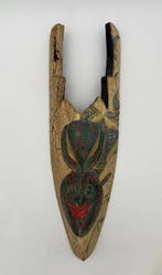 9 janv. 24JANSSENSWilrijk - Masque africain en bois clair et traces de peintureMasque africain en bois clair avec traces de peinture bleues et blanches. Largeur : 22 cm, hauteur : 45 cmEnlèvement ou Envoi