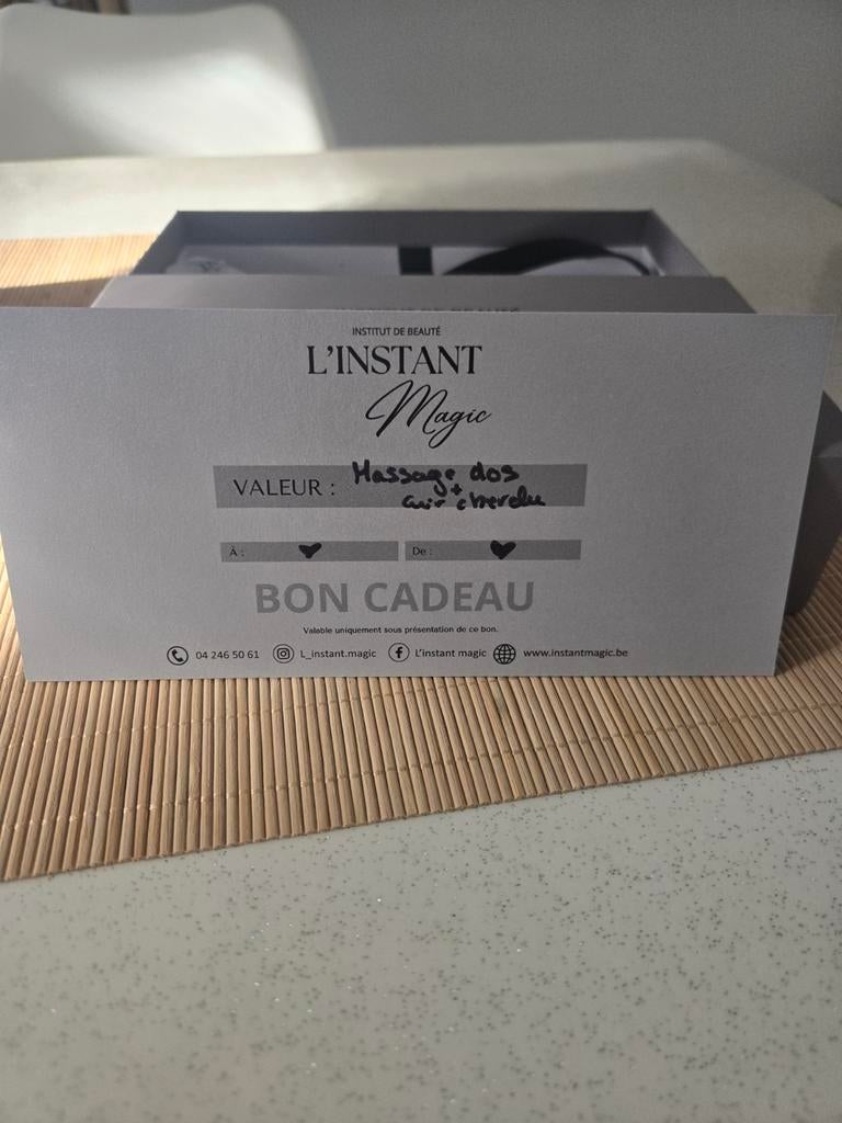 - Bon cadeau à L' instant Magic, Massage dos+cuir cheveluBon massage dos + cuir chevelu je vends cet objet parce que je n aime pas , a venir chercher chez moiEnlèvement ou Envoi