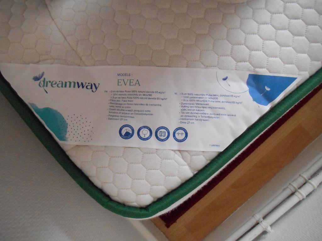 21 mars 26PrinceFlorenville - MatelasTrès bon matelas dreamay evea, d'une grande qualité de fabrication et quasi neuf. Acheté en avril 2022. Encore une année de garantie. Voir la description sur la troisième photo. Housse du matelasEnlèvement