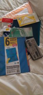 Cahier de brouillon, grand cahier ligné (jamais utilisé), marqueurs, crayons ordinaires, gomme, plumier, 5 euros le tout