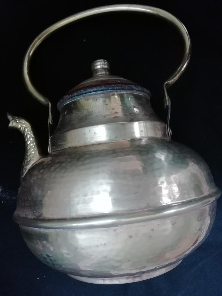 - Bouilloire 'Mécap' en cuivre rougeAntique mais neuf et scintillant ! ! ! Cuivre rouge avec manche et queue en cuivre jaune - fond marqué d'un éléphant et d'un ange ciselant - mécap-Enlèvement