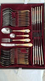 13 févr. 26AlexBruxelles - Ensemble de couverts de luxe 70 pièces, plaqué orMénagère sbs solingen 70 pièces, coffret toscana de luxe avec incrustations bleu cobalt. Or 24 carats plaqué sur acier au nickel-chrome. Dans son étui d'origine avec clé prix d'origine 2 400 &Comme neuf Enlèvement ou Envoi