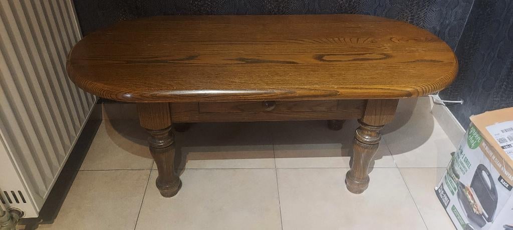 - Table de salonTable basse de salon en bois massif avec pied sculpté en chêne brun foncé en très bon état avec un tiroir 120x60 hauteur 50 cmUtilisé Enlèvement
