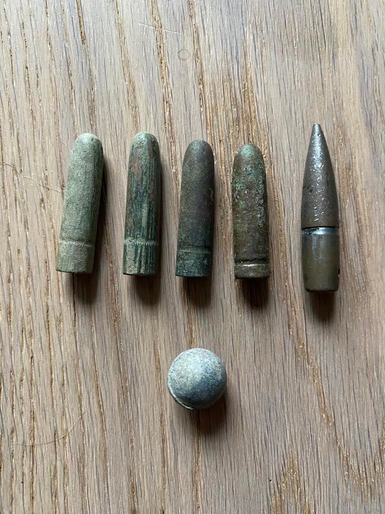 27 mars 26DanHeppen - wo2 - Duitse 15 mm loden punten - LEEGLotje van 5 duitse loden punten. Heel speciaal met 5! Drijfbanden !!! Caliber meet ongeveer 15 mm! Vermoedelijk gebruikt door/voor het "kleinstkanone 34" dit zijn oude bodemvondsten die opgeEnlèvement ou Envoi