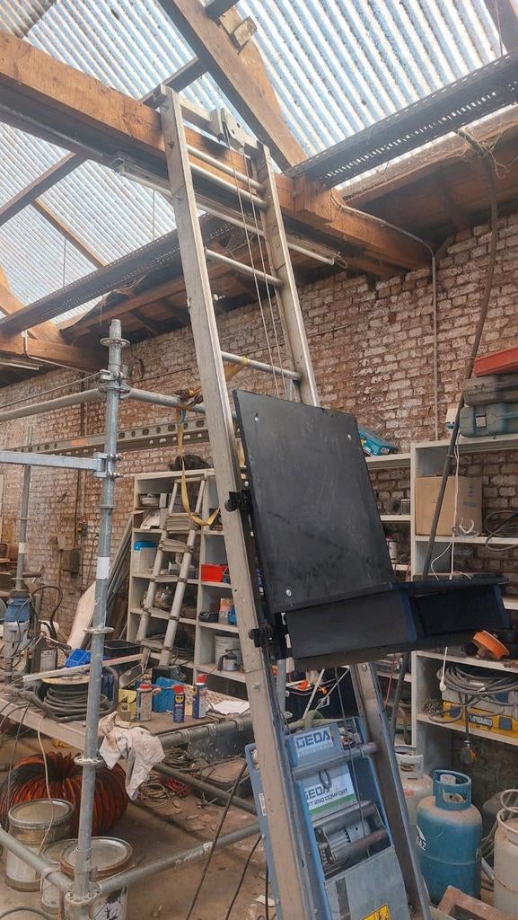 Avant-hierOuvrierNamur - Monte tuiles Simplex en aluminium 19m 220 V très solideà vendre : monte‑tuiles en aluminium simplex d’une longueur totale de 19 mètres. Il s’agit d’un ancien modèle de fabrication allemande, reconnu pour sa robustesse et sa fiabilité exceptionnelles. UneUtilisé Enlèvement