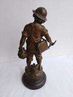 - F. Moreau - sculptuur, Giovane Scolaro - 46 cm -Art nouveau-sculptuur gesigneerd f. Moreau – jonge scholier met boek en vruchten – frankrijk, ca. 1890-1910Elegante decoratieve beeldhouwwerk dat een jonge scholier met boek onder de arm en takken met