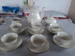 25 janv. 26TineKampenhout - Service à café en porcelaine bord doré Mosa MaastrichtService à café en porcelaine bords dorés mosa maastricht 1 cafetière 1 crémier 1 sucrier 7 tasses 12 sous-tasses dorure usée sur certaines piècesEnlèvement