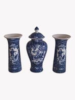 17 avr. 26walterOpwijk - Mosa, Maastricht - dekselvaas (3) - AardewerkDrie aardewerken vazen van mosa, maastricht (nederland), in delfts blauw met handgepainted chinoiserie figuren en lotusblaadjes, met een gesloten vaas (hoogte 28 cm) en twee identieke zijvazen, circa