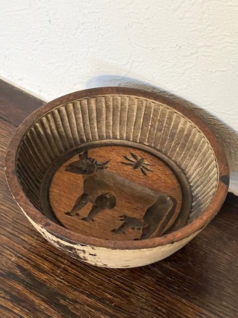 Avant-hierPub au topCatawikiToute la Belgique - Moule a beurre en bois à décor de vache.Moule à beurre ancien en bois à décor de vache. En bon état. Diamètre : 15 cm. Hauteur totale : 6 cm. Origine française.Enlèvement