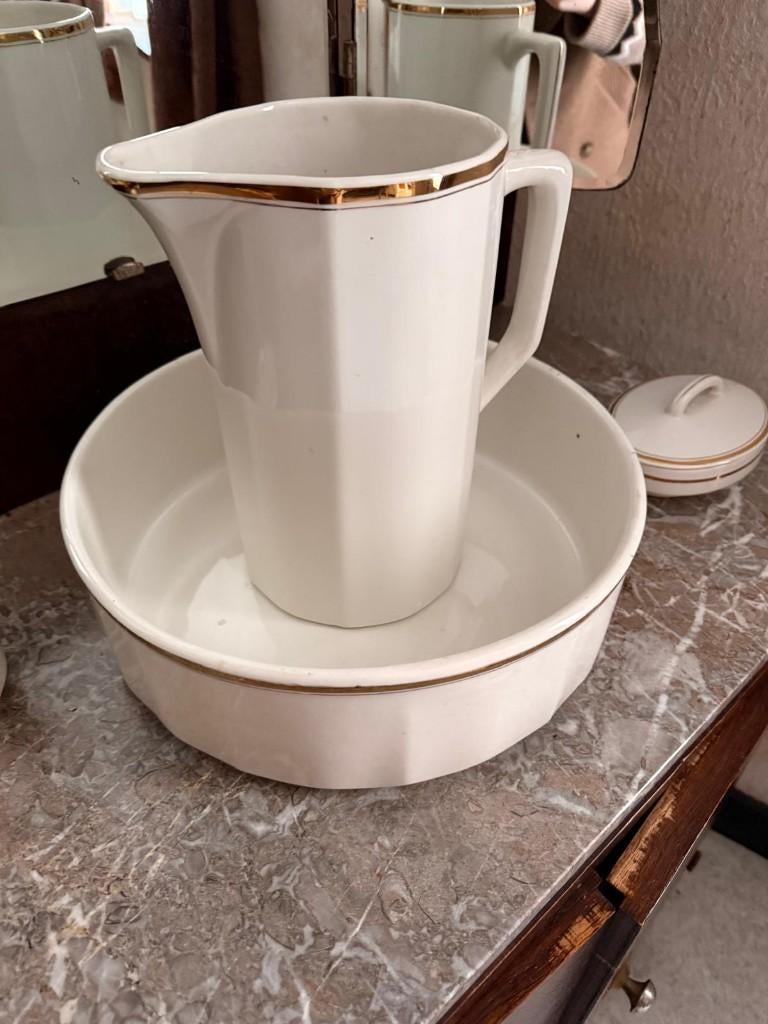 15 mars 26ChantalIngelmunster - Waskom, waterkan, pispot, toebehoren-waskom 44cm diameter , kleine beschadiging (stukje af) -waterkan 33cm hoog, volledig intact -pispot 23cm diameter, met handvat 28cm. Volledig intact -langwerpig potje 22/9vm, bakje intact, oortje vanEnlèvement