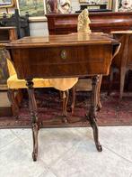 12 mars 26VanessaHaachtOude naaitafel met gietijzerenonderstelEnlèvement Comme neufHaacht12 mars 26 - Middentafel - WortelnotenhoutVictoriaans notenhouten werktafel uit circa 1850–1900, in nootgewijde hout met intarsia en spiegel, met uitslaande zijvleugels, lades en een intern scharnierend spiegel, met een gedraaide voet en gebe