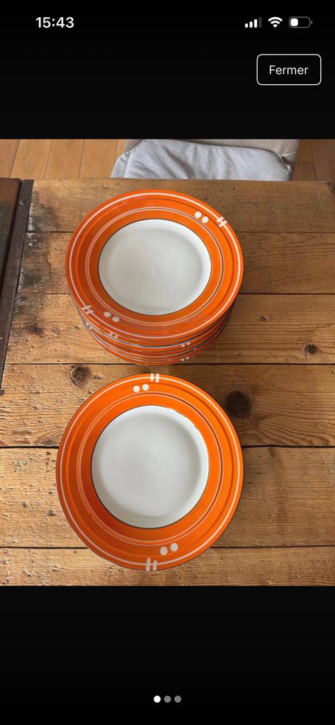 11 juin 19gingersoldeIxelles - 10 petites assiettes vintage orange, Made in CzechoslovakiaLot de 10 assiettes à dessert vintage en faïence. Décor orange graphique typique des années 70. Tampon au dos : made in czechoslovakia. Bon état général. Bord noir légèrement abîmé sur certaines à retEnlèvement