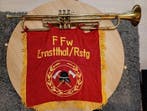 HierS.MilitariaKermt - Unknown - Ceremonialna, in Es - - Trompette - Allemagne -Trompette cérémonial en es, fabriquée en allemagne en 1975, laiton, deux objets au total, numéro de série e400, longueur totale 90 cm, largeur de cloche 13 cm, poids 3 kg, état physique très bon et te
