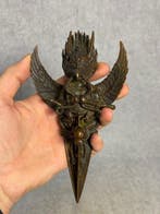 - Objets religieux et spirituels - Bronze - 1980-1990 -Phurba tibétain en bronze, rituel, avec figure de garuda sur le dessus, lame triangulaire à trois faces, daté 1980–1990, dimensions 17,5 cm x 10 cm x 3 cm, poids 320 g, en bon état d’usage avec signes