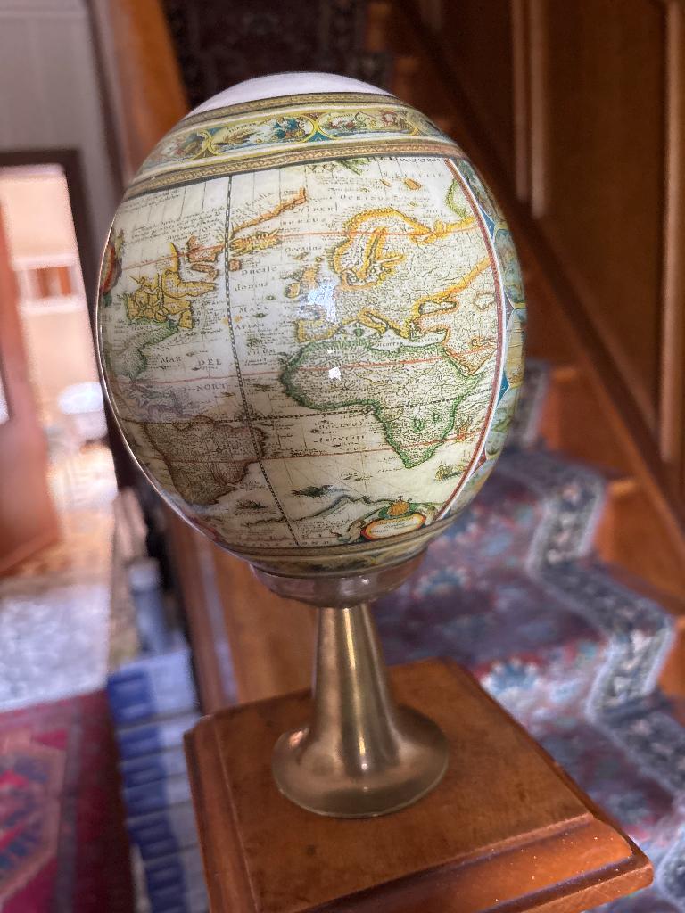 16 août 24svbeverSt-Kwintens-Lennik + Deel Roosdaal - Oeuf d’autruche véritable décoré et monté en art décoratifDécor peint et laqué avec : • une carte du monde ancienne (style cartographie xviiᵉ–xviiiᵉ) • guépards (animaux de savane) monture avec 2 cornes naturelles sculptées et socle en laiton.Enlèvement