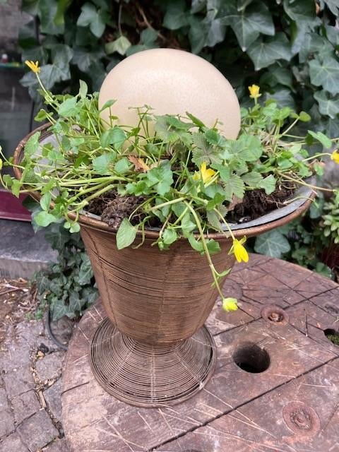 16 mars 26AllesMoetWegBrugge - Grand œuf d'autruche décoratif uniqueMagnifique grand œuf d'autruche sud-africain décoratif sur bois d'hévéa écologique. Un véritable accroche-regard. Hauteur environ 19 cm diamètre environ 12 cm poids environ .450GNeuf Envoi