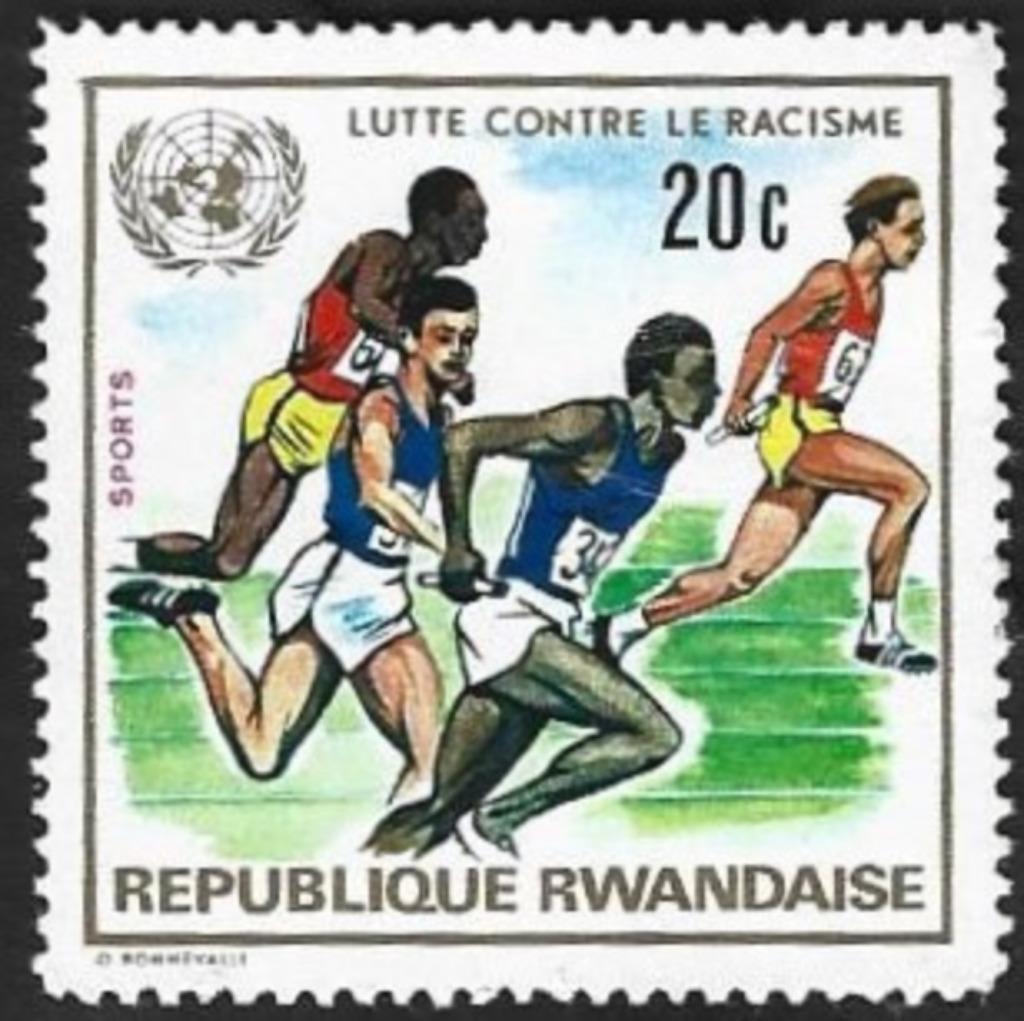 - 1 Postzegel Internationaal jaar strijd tegen rascisme RwandaJaar 1972 maand 10 nominale waarde 20 volgnummer in uitgifte groep 1 blank en zwart sporten samen ontwerper/graveur bonnevalle, oscar [1920-1993]Non oblitéré Enlèvement ou Envoi