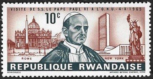 14 mars 26JPIEeklo - 1 Postzegel Paus Paulus VI Rwanda 1966Jaar 1966 maand 02 nominale waarde 10 volgnummer in uitgifte groep 1 sint-pietersplein in rome, gebouw van de verenigde naties en het vrijheidsbeeld ontwerper/graveur bonnevalle, oscar [1920-1993]Non oblitéré Enlèvement ou Envoi