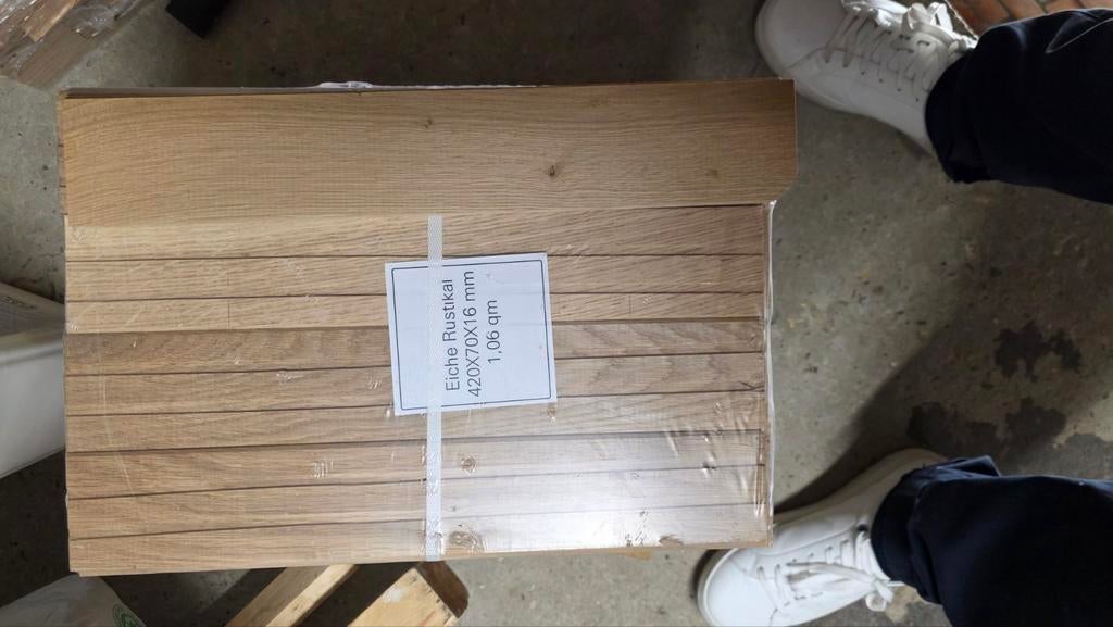 27 mars 26TomIzegem - Parket eik16 m² vol eiken parket (geen meerlagen parket) klasse rustiek. Visgraat 42 cm lang x 7cm breed en 1.6Cm dik 25 euro per m². (Winkelprijs 53 euro per m²) dit is een overschot van mijn verbouwing.Enlèvement