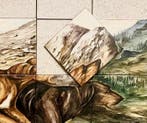 Avant-hierHandelonderneming van ViegenMaurik, NL - Panneau - Céramique - Ensemble de 18 piècesPanneau composé de 18 tuiles peintes à la main de 20x20 cm, assemblées pour représenter une scène de chasse avec deux chiens en poursuite, dans le pur style céramique vietri d’italie, entièrement arti