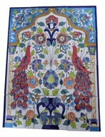HierPub au topCatawikiToute la Belgique - Carreau - Panneau mural en céramique tunisienne - 12Panneau mural en céramique tunisienne composé de 12 carreaux peints à la main, style méditerranéen, dimensions environ 38 × 40 cm, chaque carreau environ 10 × 12,5 cm, profondeur 1 cm, état très bon,