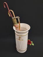 - Porte-parapluies - CéramiqueSupport parapluie en céramique blanc émaillé, fabriqué en allemagne de l'ouest, dating de 1960–1970, dimensions 25 cm profond, 45 cm haut et 23 cm large, motif relief de parapluie avec accents dor