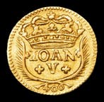 - Portugal. D. João V (1706-1750). Pinto (480 Reis) 1725 -Portugal, koninkrijk onder koning d. João v (1706-1750); pinto (480 reis), 1725 coroa de 5 arcos in goud, gewicht 1,09 g, diameter 14,10 mm, toestand xf+/aunc. Portugal - monarchie - d. João v (1706-1