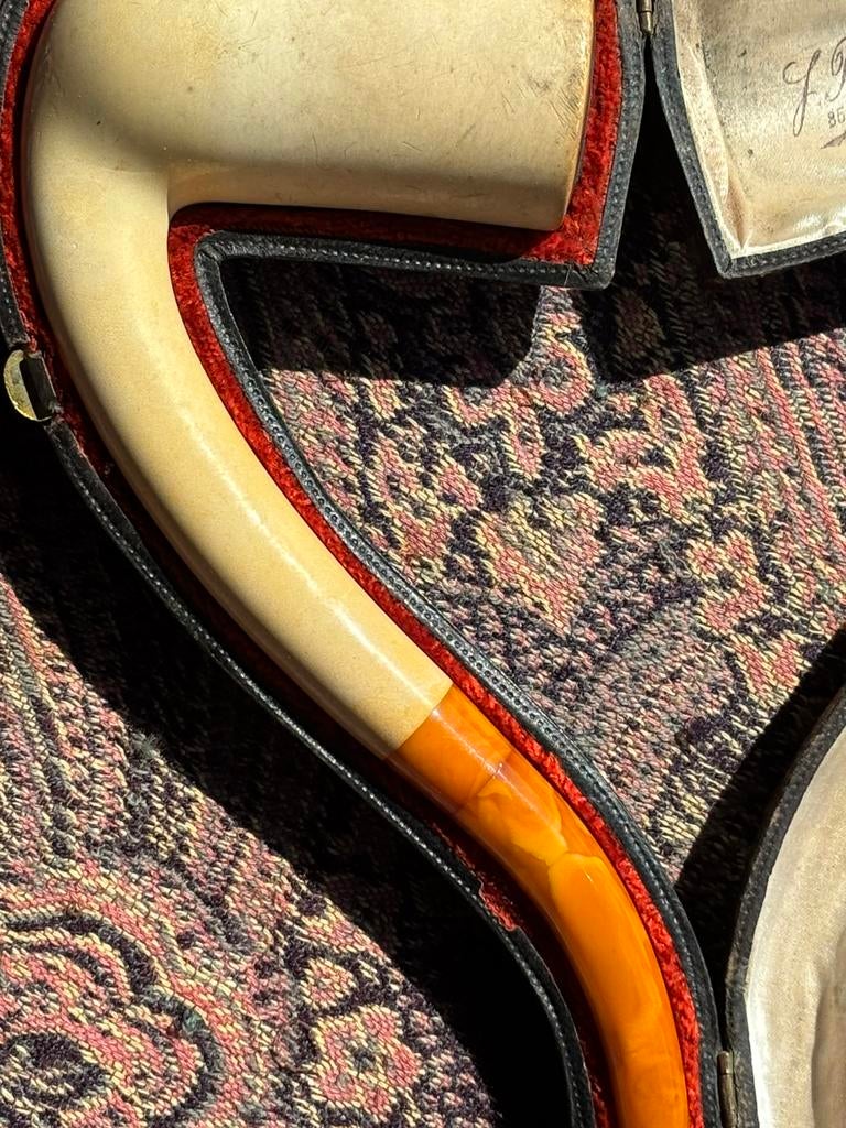 - Pipe en écume de mer et ambrePipe ancienne ou fume-cigarette dans un étui en cuir. La pipe est en écume de mer et est en bon état. Le bec en ambre est malheureusement endommagé, comme le montrent clairement les photos. La pipe meEnlèvement