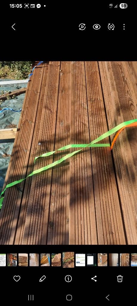 HierKriswoodEynatten - Bois de terrasse4m2 de planche de bois imprégnée d’extérieur (2.2Mx2.2M), 17 planches au total. 2 Planches de bois marin 2.3Mx1.15M. Utilisés 1 an. Tout est démonté, prêt a emporterComme neuf Enlèvement