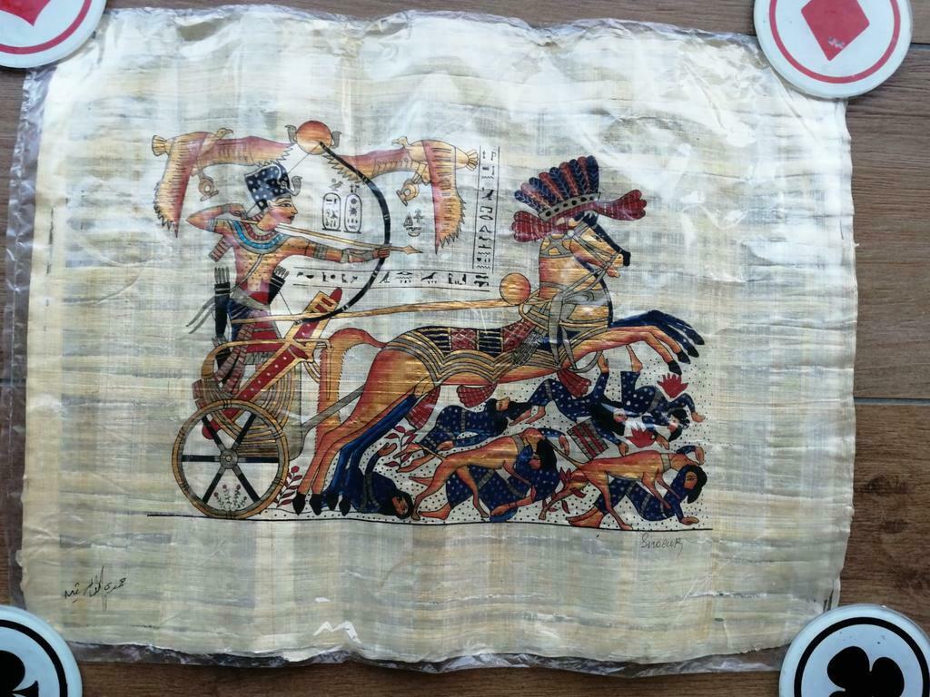 29 mars 26SabrinaMalines - Papyrus égyptien signé (Ramsès II dans son char)Papyrus égyptien : le papyrus est fabriqué à partir de la plante cyperus papyrus qui pousse dans l'eau douce du nil. Il y a plus de cinq mille ans, les anciens égyptiens ont commencé à fabriquerComme neuf Enlèvement ou Envoi